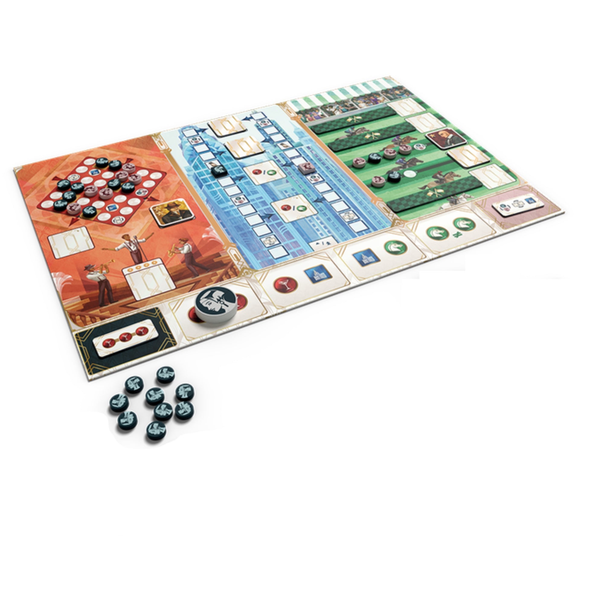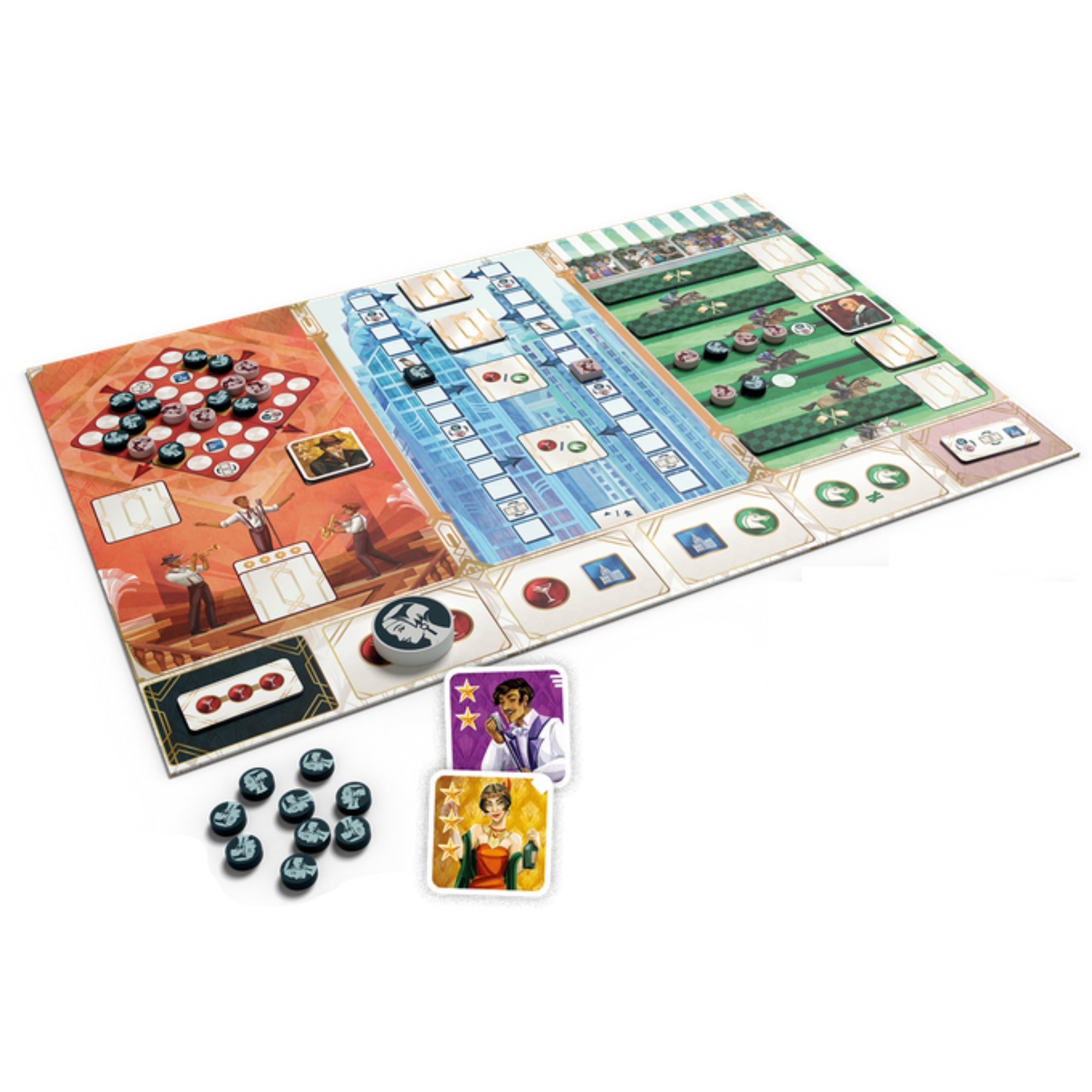 In dit spel probeer je kleurrijke karakters te verzamelen. Om het spel te winnen moet je alle 3 karakters van 1 kleur of minimaal 1 karakter van elk van de 5 kleuren hebben. Ben je aan de beurt, dan voer je een actie uit om op 1 of 2 locaties vooruitgang te boeken, zodat je karakters op die locaties kunt benaderen. Zet je breedste glimlach op bij het cabaret, win in het financieel centrum de harten van rijke klanten of span je paard aan de juiste wagen op de renbaan. Houd je tegenstander goed in de gaten, want voor je het weet bereikt hij het karakter waar jij een praatje mee wilde maken eerder! Win jij de meeste karakters en maak je daarmee de meeste indruk op meneer Gatsby?
