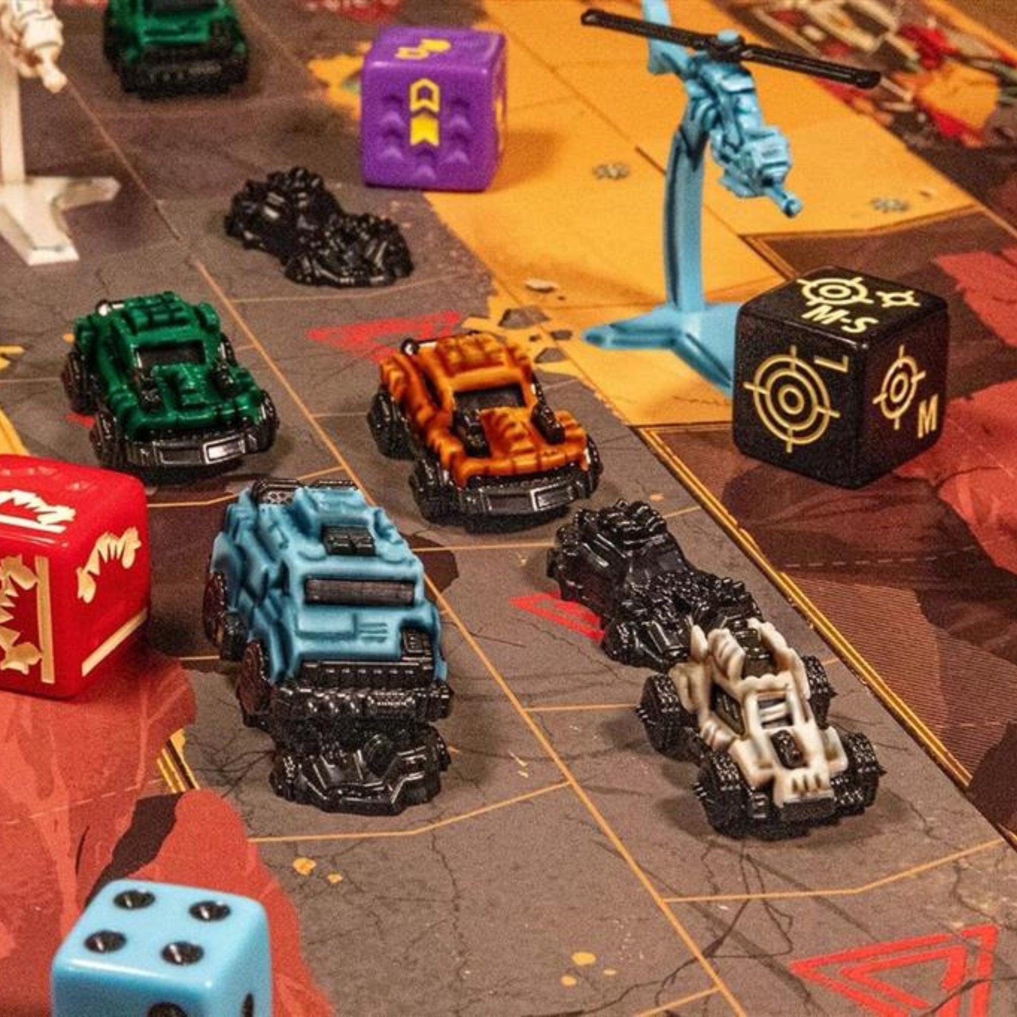 With detailed vehicle miniatures, robust dice, and the signature "infinite" road system, this is a racing game like no other. The chaotic action is brought to life by illustrator Marie Bergeron's signature style.