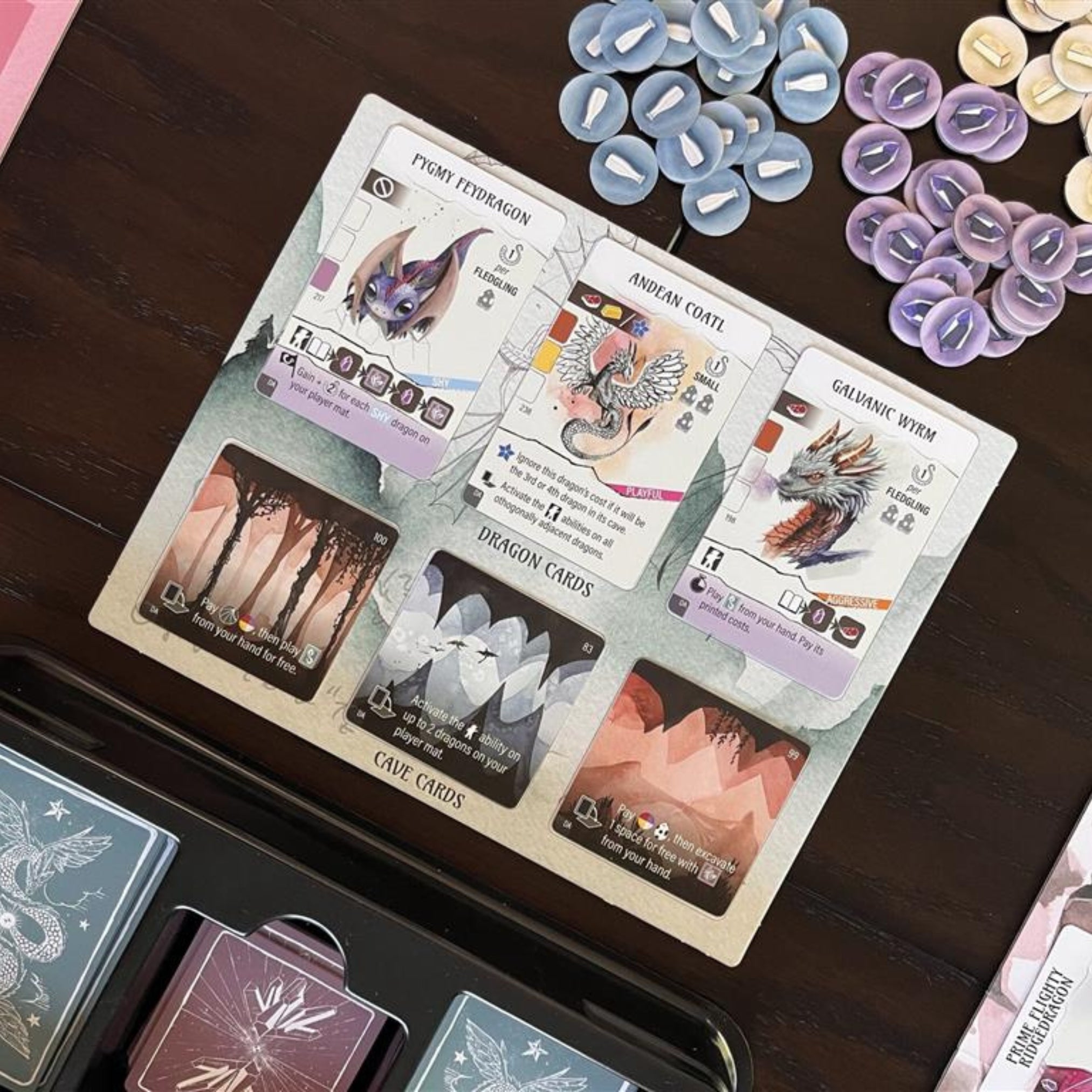 Replace the required materials with the new components. Then add all dragon cards, cave cards, dragon guilds, and objective tiles to their respective stacks. If a player decides to pass, the new round track tableau offers additional options. The new dragon teenagers can also be trained in a unique way!